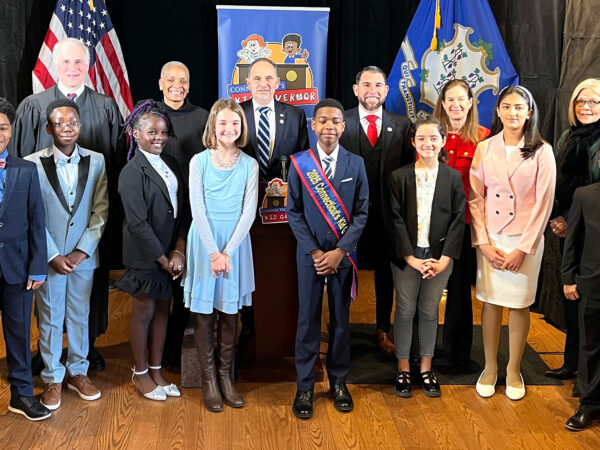 2026 Connecticut Kid Governor Tessa Hallinan, her Cabinet, Rep. Yaccarino, 2025 Kid Governor Keudy Martinez, Sen. Cicarella, Secretary of State Stephanie Thomas, Lt. Gov. Susan Bysiewicz, Chief Academic Officer Irene Parisi, and Supreme Court Justice Steven Ecker gather at the Kid Governor Inauguration held at Connecticut’s Old State House.